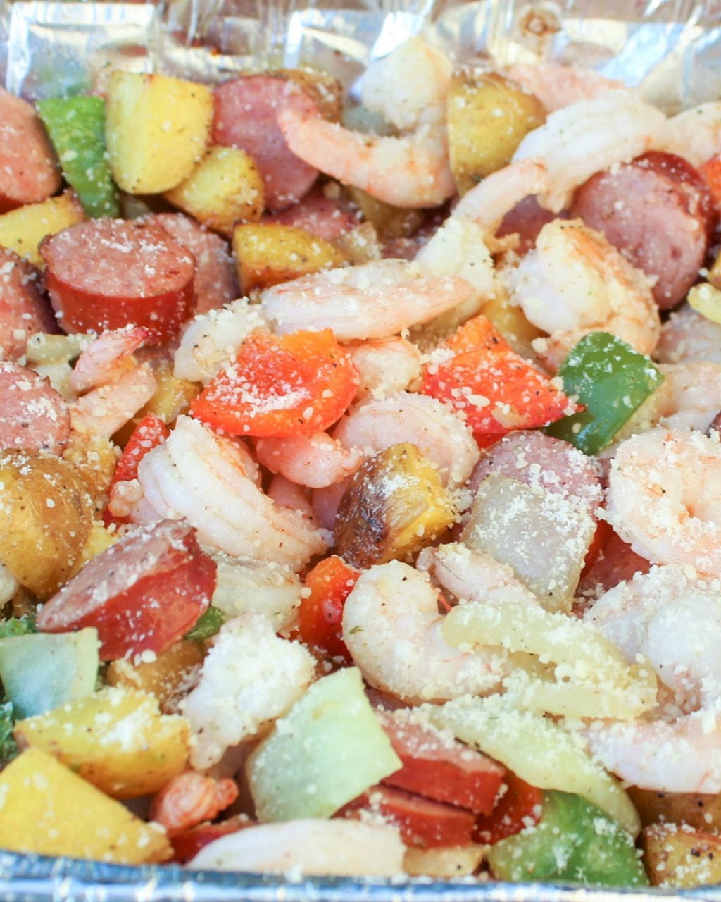 Ingredients 1 large onion, diced into ½” pieces 1 large bell pepper (any color), diced into ½” pieces 1 lb smoked sausage, sliced into ¼” coins 20 large raw shrimp, peeled and cleaned (tail on or off) 2 tsp minced garlic ½ tsp black pepper ¼ tsp salt ½ cup unsalted butter 4 Tbsp Parmigiano-Reggiano, … Lire plus