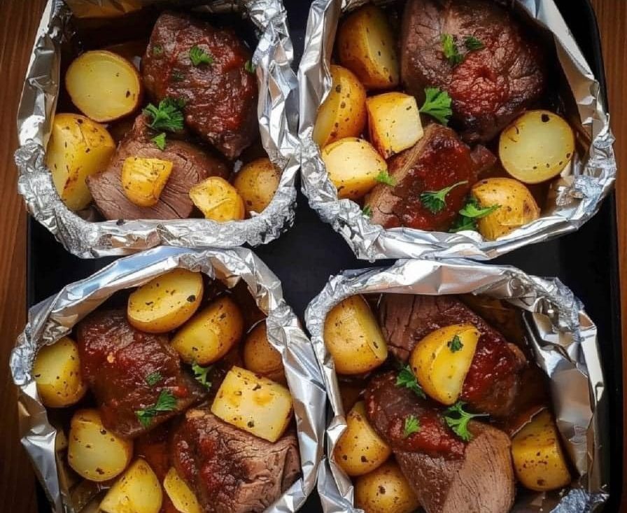 Evenly distribute the steak and potato mixture among four aluminum foil sheets measuring 12×12 inches for packet preparation. Make sure the foil packages are tidy and secure by sealing the contents with care. That way, the flavors won’t escape and will only get stronger as they simmer.